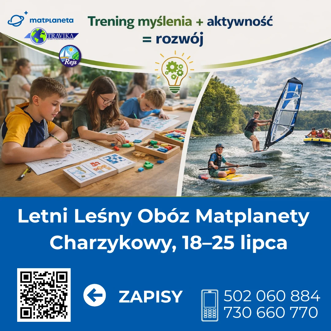 Zapraszamy do zapisów na letni obóz Leśna Szkoła Matplanety, który odbędzie się w malowniczo położonym Ośrodku Wczasowym Rejs w Charzykowach w terminie 18–25 lipca 2026 r. dla dzieci w wieku 7–14 lat.